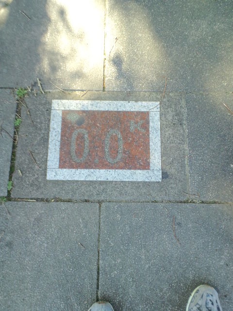 およそ10㌔コースの始まりが西東京・田無(マップのSTARTのマーク・右の写真0㌔地点)なのです。ランナーにとって100mごとに距離表示あるのは、助かります。
