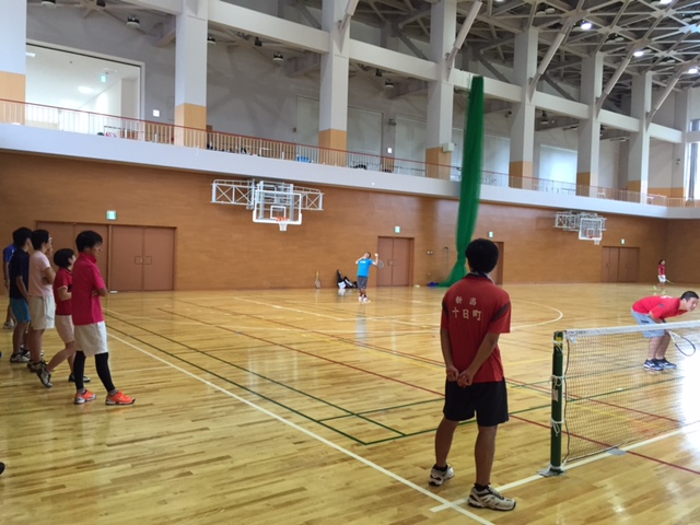 開始1時間。突然の雨で、できたて?の体育館でインドアとなりました。 現役高校生から大人まで、世代を超えてチームを作り、団体戦で戦います。