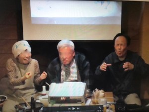 内容は、私の所属する「占子の兎」の座布団劇場での代表作『らーめん屋』の本番映像(3人が登場する落語)を会場に持ち込んだスクリーン(写真上部)に映しながら、その前で、私(客)と実際に御夫婦のYさん(爺さん、婆さん)が手話通訳するという余興です。