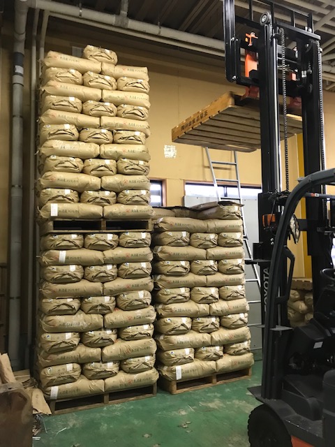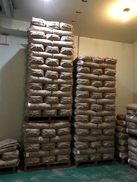 今年は、例年よりお米の収量が減っていて、倉庫のスペースもやはりいつもよりややゆったり。お米を積み上げるはずのパレットが、空パレットとして積み上がっている様子からも収量減は明らかでした。