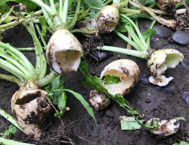 地面に埋まっている状態では、ぱっと見、実は特に問題ないように見えて、実際はかなりのカブが被害を受けていて、半分以上、破棄しました。(おそらくこの後に全廃棄になるでしょう・)