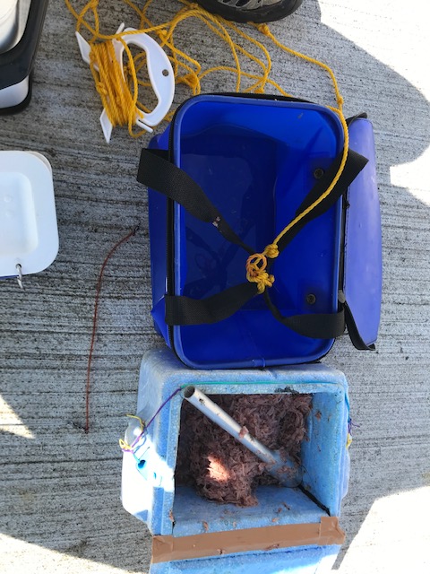 急きょ、まき餌用に持ってきたケースをバケツがわりに、餌のオキアミの保冷用のオリジナリケースをまき餌入れにする応急処置。何とかリカバリーできました。😓