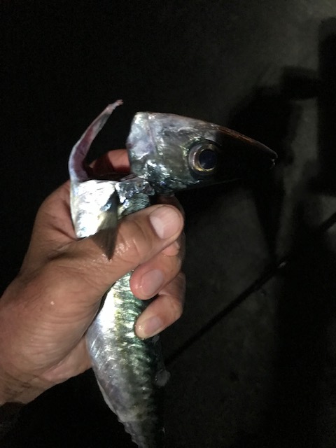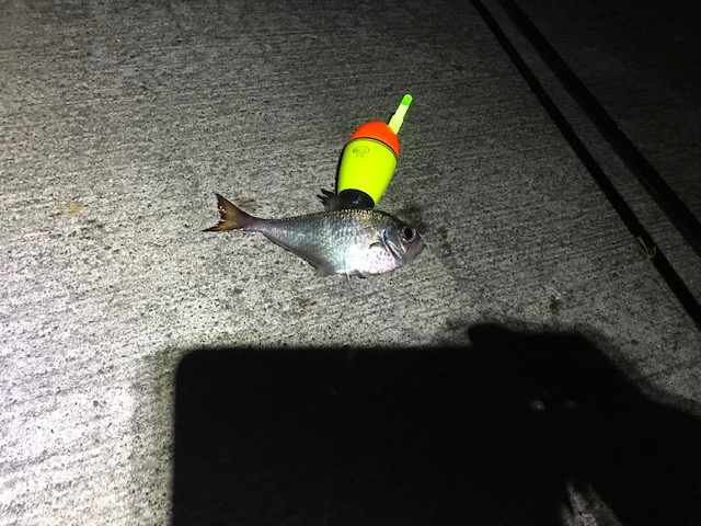 ヘッドライトとウキの蛍光スティックが頼りの何となく心細い夜釣りですが、その後は、