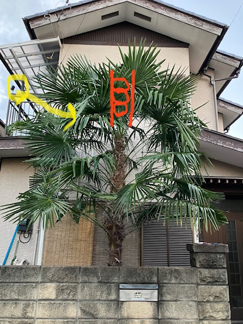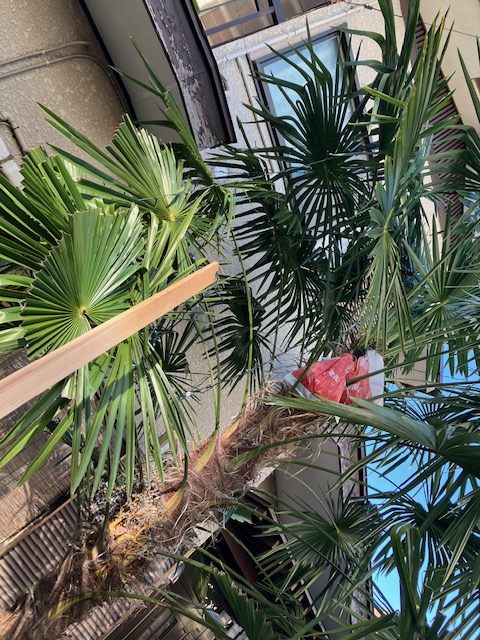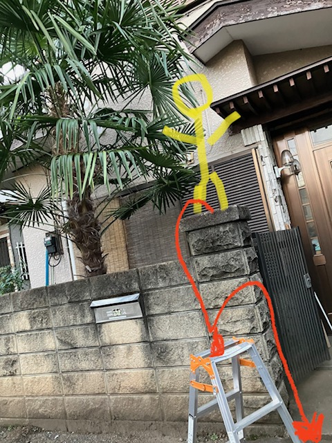 でも、シュロの新芽の位置は、下の根元が壁の上に登って辛うじて手で触れるくらいで、壁(2階の窓)からも下からも簡単には手が触れることのできないところにありました。💦