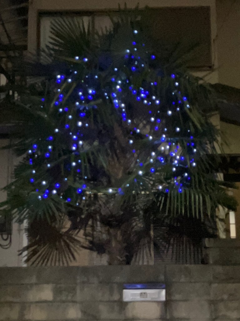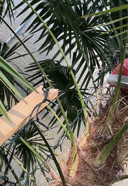 もみの木でも、かわいい小さな木でもないのに、50mもあるLEDの配線を巨大なシュロにどのように飾り付けるか?