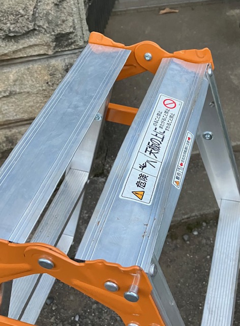 疲れもあったと思いますが、写真のように門の上から、まずは脚立の天板に腰からぶつかり、地面へ😵 (脚立の天板は大きく曲がり、手で戻しましたが・・・写真の通り💦)