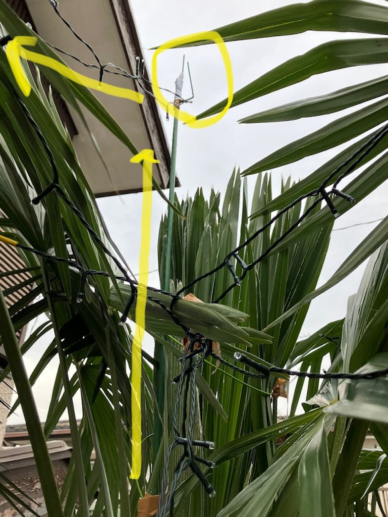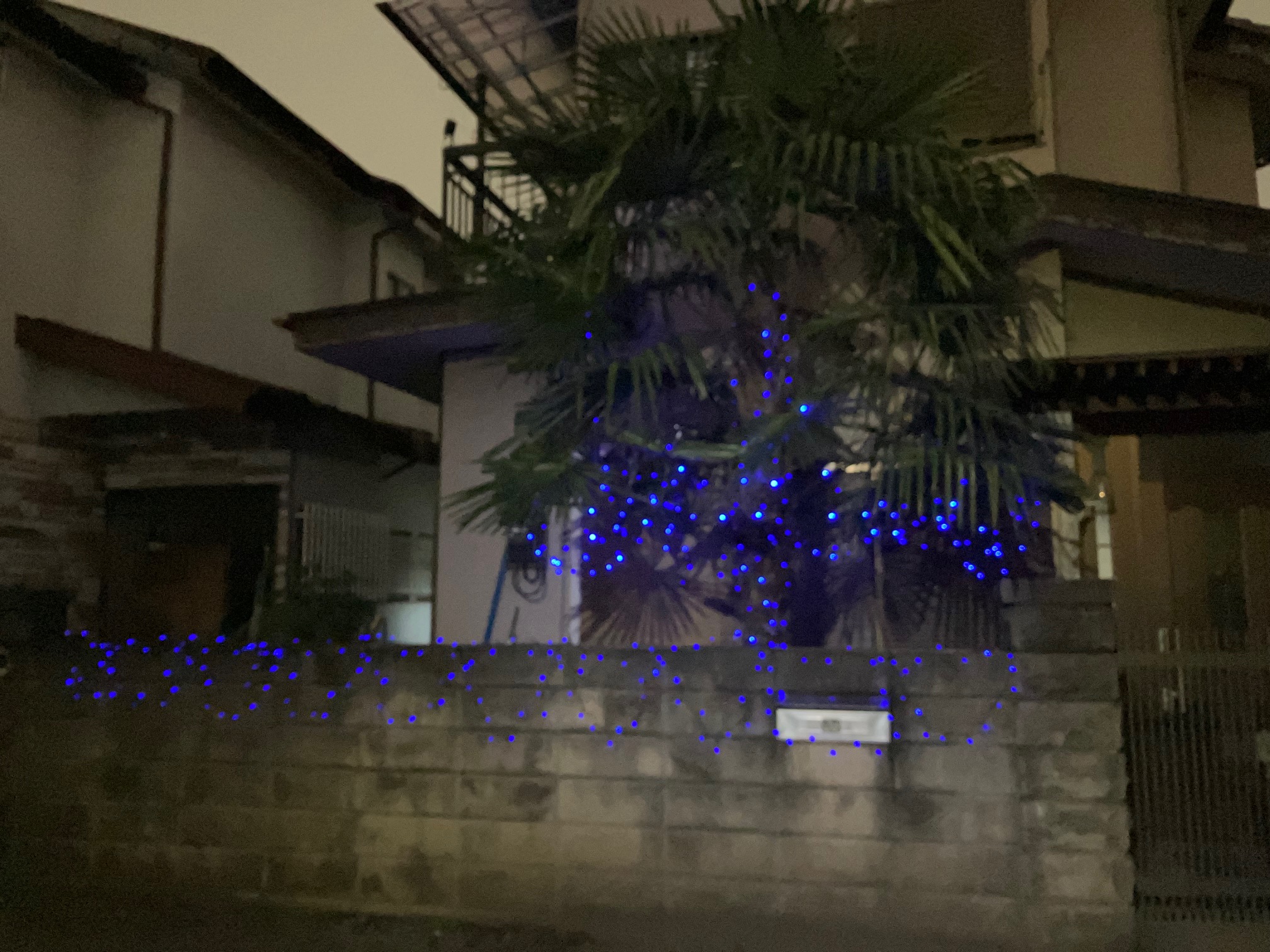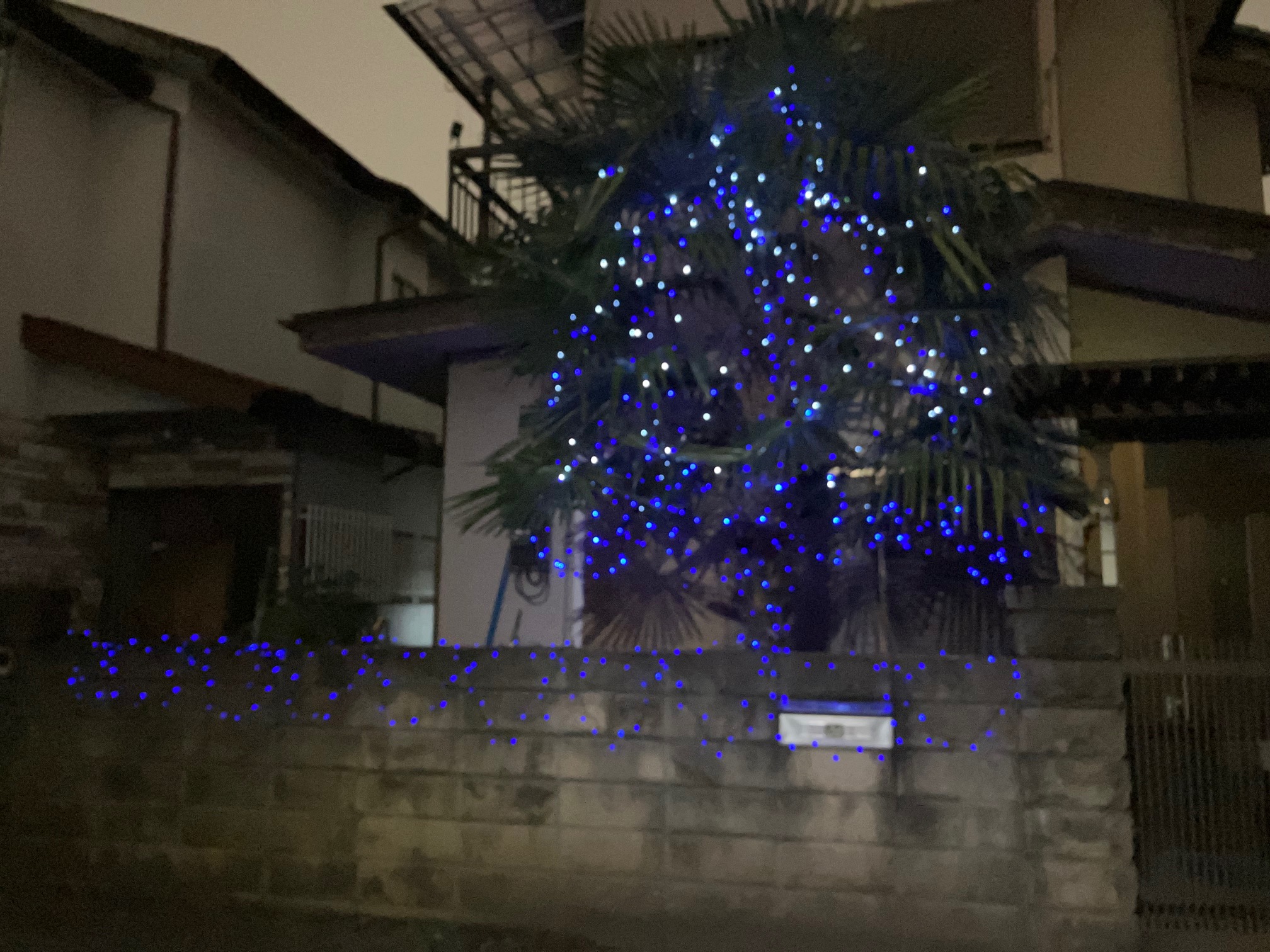 前回お伝えしたように4メートル近いシュロの上部は、手が届かず、引っ掛け棒(約130cm)を使ってLEDをただ乗せたり、引っ掛けたりするだけで、塀の狭い上部での作業は危険を伴うので、これ以上飾ることは厳しいと判断、シュロの葉の下の部分に明かりを足すことに。