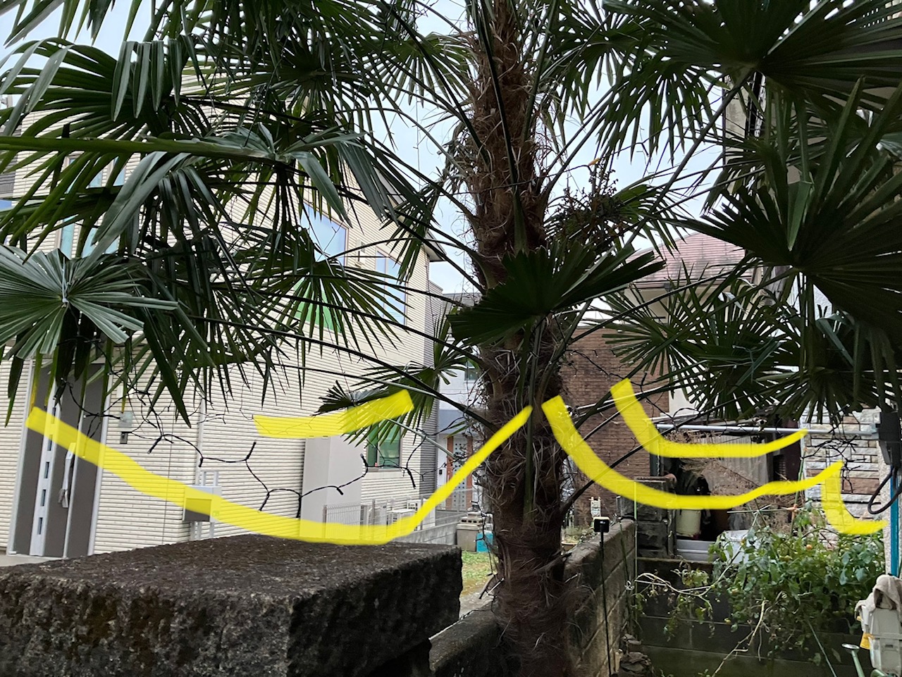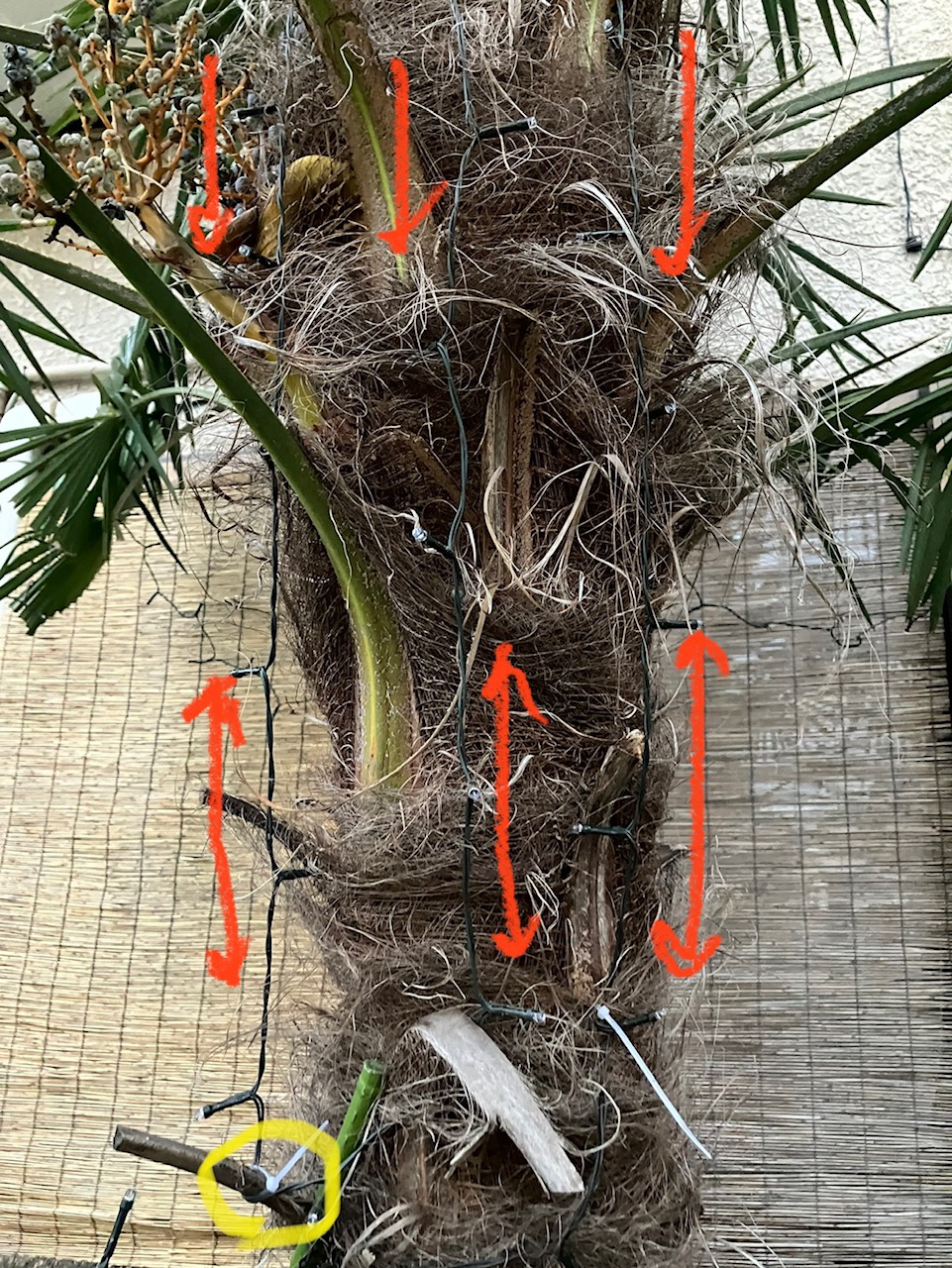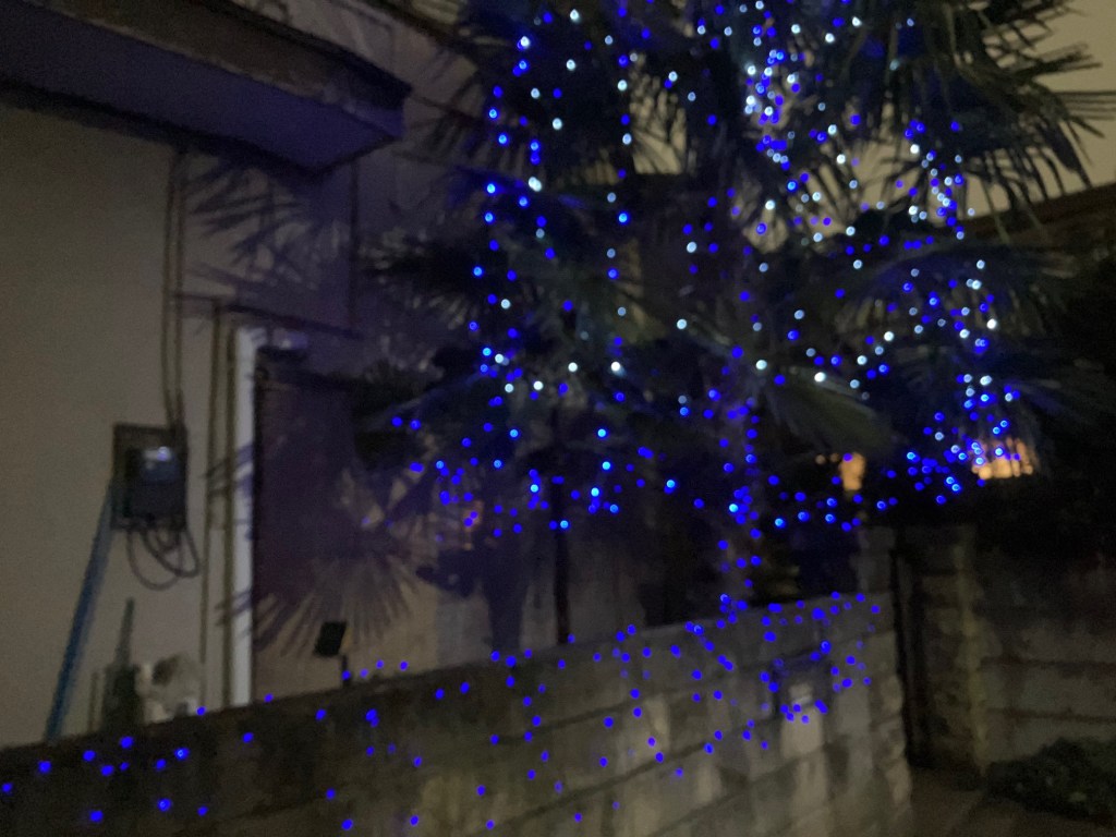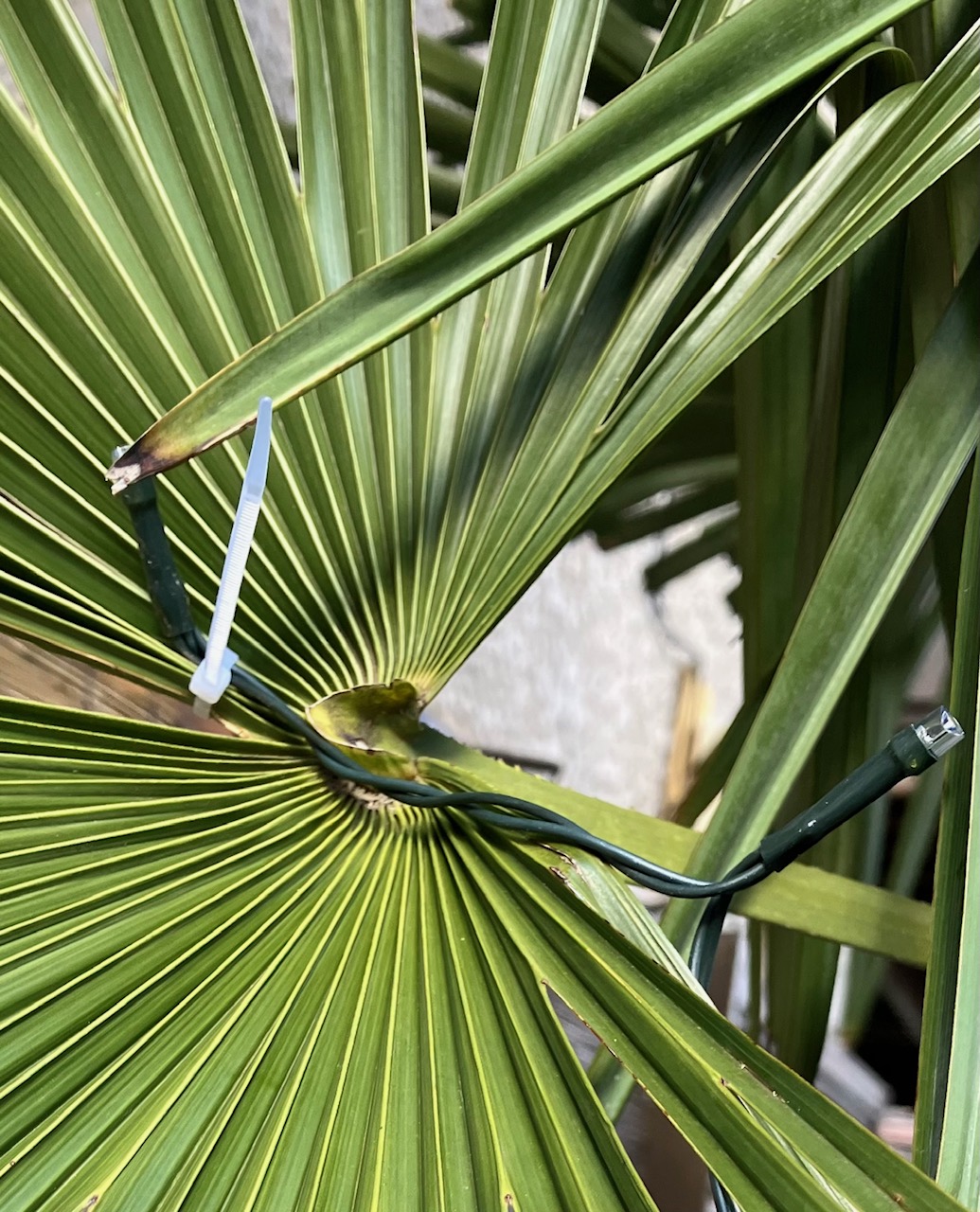 前回お伝えしたように4メートル近いシュロの上部は、手が届かず、引っ掛け棒(約130cm)を使ってLEDをただ乗せたり、引っ掛けたりするだけで、塀の狭い上部での作業は危険を伴うので、これ以上飾ることは厳しいと判断、シュロの葉の下の部分に明かりを足すことに。