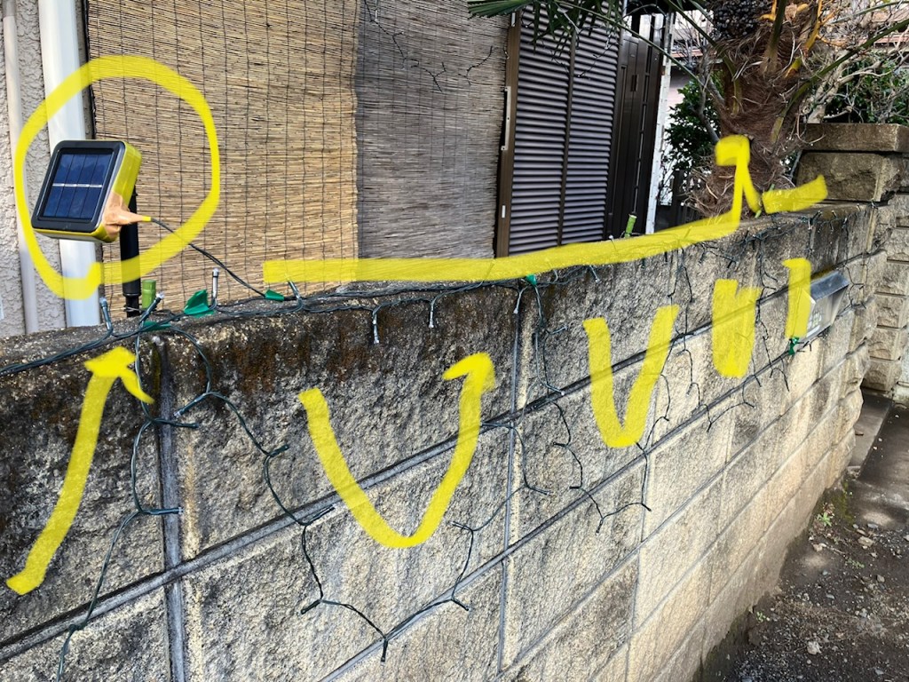 20m200球LEDを今回は2セット使用したので、もう1セットは玄関のブロック塀に使うことになりました。