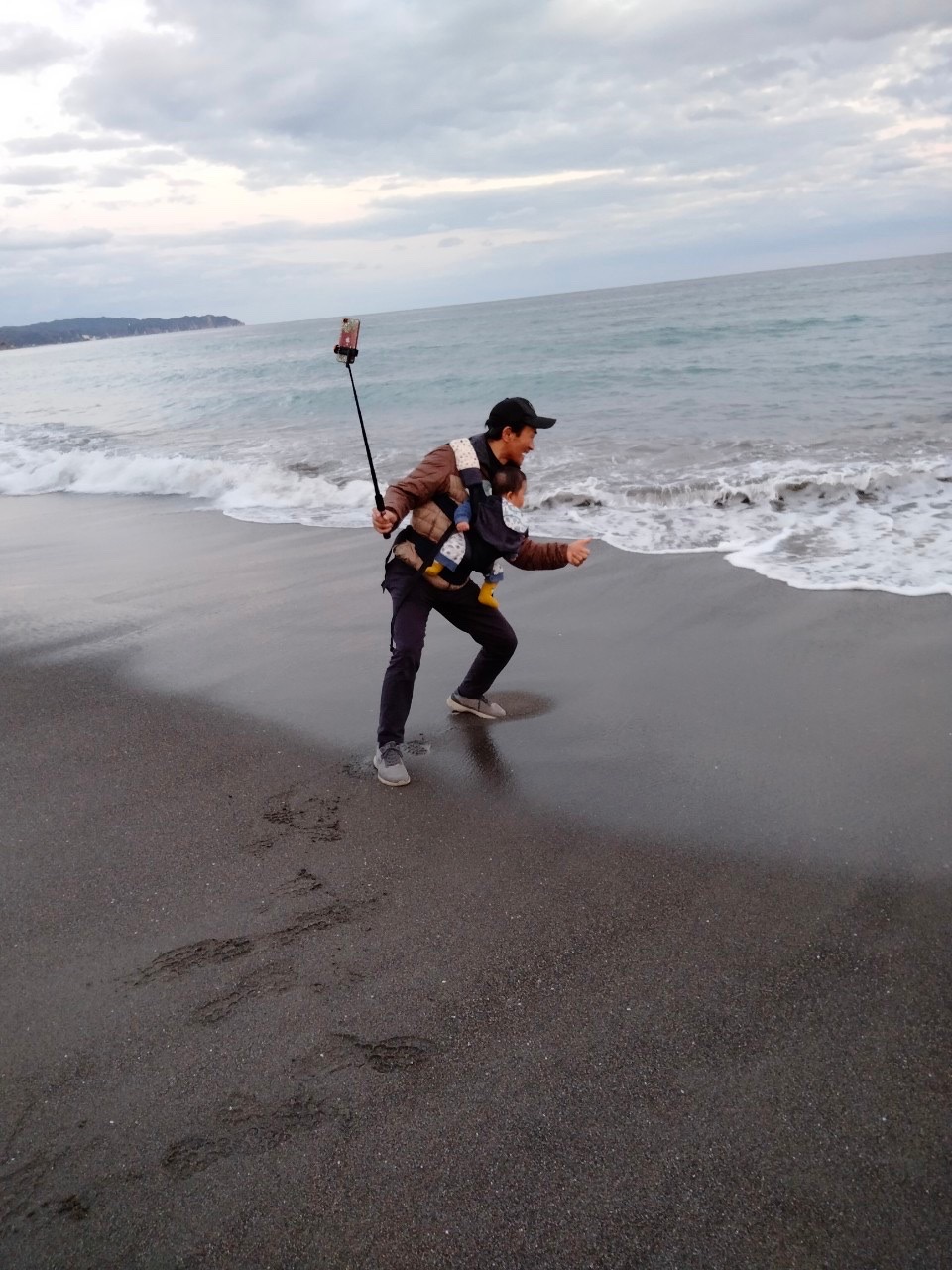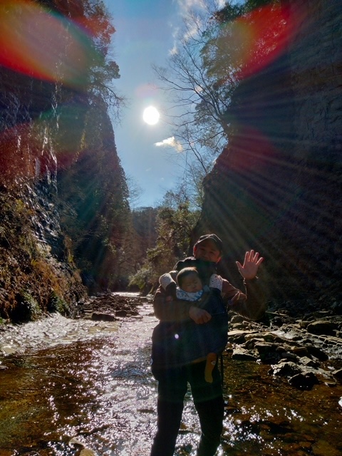 今回、屋外での息子の移動は私の担当で、子供が景色を楽しめるように前抱っこで。