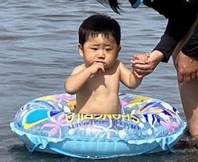 海でも使えるオムツ「スイミングパンツ」に履き替えた息子。