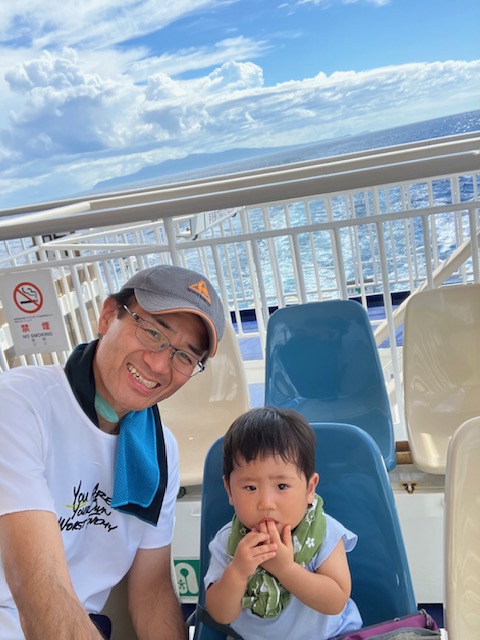 大島をバックに息子とパシャり! 息子の顔はイマイチですが、風を感じ、暑い中、船上で飲む🍺は最高でした😋