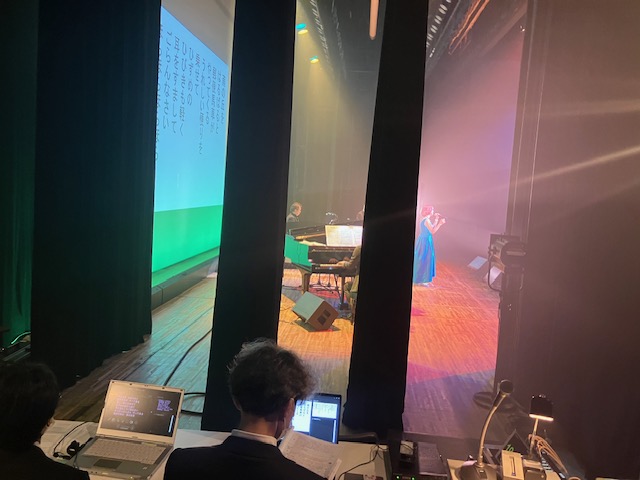 コンサートでは、主に舞台脇で出演者の出入りの交通整理、投影映像が順調に行われているか等、たまにモニター映像も確認しながら、コンサートが滞りなくおかなわれるよう裏方として補助的な動きをしていました。