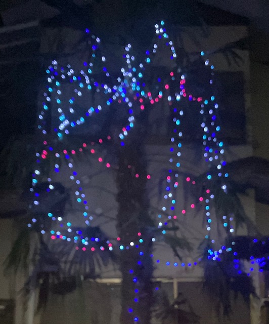 夏、秋に、シュロ全体のバランスを考えて枝葉の刈り込みを行なったため、折れた部分の葉っぱを失うことはイルミネーションだけでなく、昼間の木の見栄え(バランス)にも影響があるだけにショックでした😵