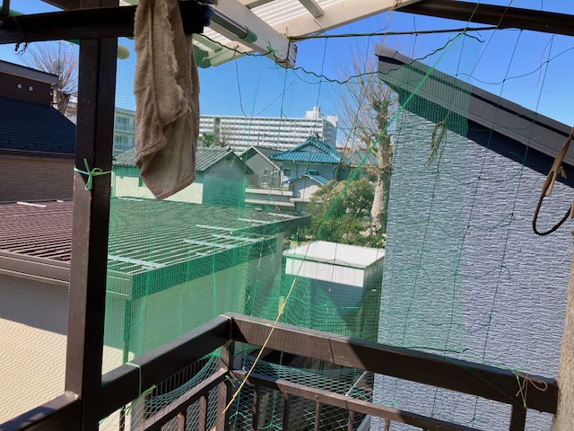 洗濯物を干す(乾かす)スペースを確保するために、手すりの上の部分全面を防虫ネットで覆うわけにはいかないので、上下(かみしも)の一部分に。
