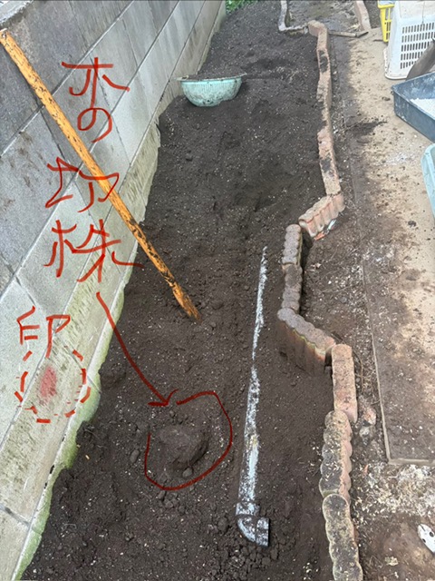 木の切り株、雨樋の水を地面に運び流すパイプ。うっかり鍬で一部を壊してしまいました💦
