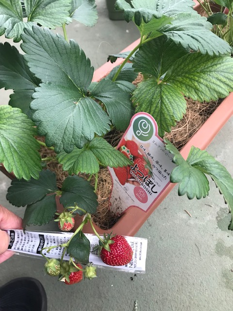 とはいうものの、2株あった「よつぼし」は、1株をすでに枯らしてしまっており(原因不明)、1株のみの「とちおとめ」も、脇芽を摘むタイミングを逃し、1株に6つもの芽をつけたまま花を咲かせてしまい、もはや手遅れ。実のサイズがどれも小さく、中には育たない硬い実も・・・😢