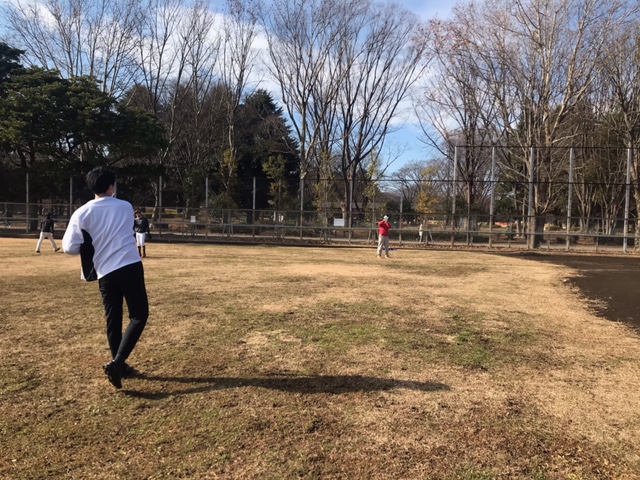 常に野球の鍛錬を怠らないSやんを経由して、2メートルの大型新人、M下くんと私で三角?V字キャッチボール。