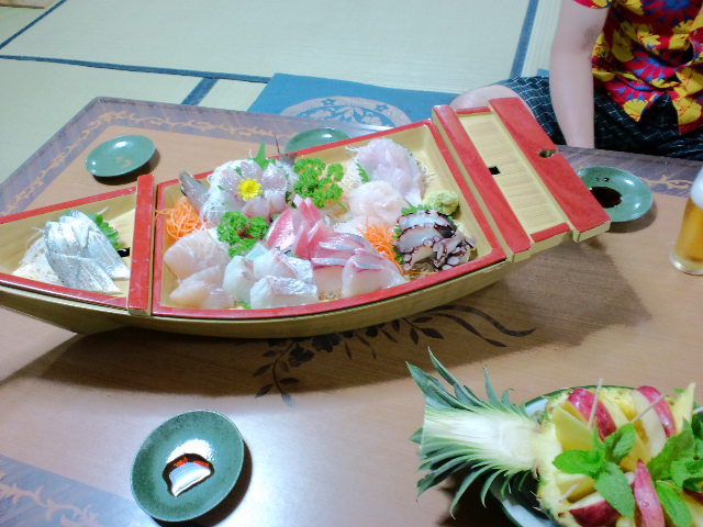中でも、BBQの量を減らして、室内での二次会に、豪華舟盛り(刺身)が四つも付いたこと。魚好きの私としては、何より嬉しかったです。